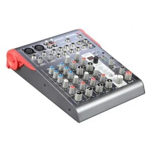 Los canales 1 y 2 ofrecer entradas combo XLR-1/4″ con función Hi-Z (para guitarras y bajos), filtros de graves (100 Hz), controles de ganancia, ecualizador de 2 bandas, enlace estéreo, faders de volumen y envíos para efectos. Los canales 3 y 4 ofrecen dos entradas de 1/4″, cuentan con control de volumen. Al activar el switch USB 3-4, los canales 5 y 6 anulan la entrada de 3.5″ y habilita el retorno USB de la computadora.La salida principal es controlada con una perilla dedicada y cuenta con conectores XLR y de 1/4″. La salida de audífonos de 1/4″ incluye un control de volumen independiente. Entre otras funciones están la de muteo de efectos.
